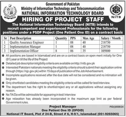 The National Information Technology Board (NITB) under the Ministry of IT and Telecom is inviting applications from experienced and competent individuals for multiple contract-based roles. These positions are part of a PSDP project titled “One Patient One ID”, and all roles will be based in Islamabad. Latest Jobs in Lodhran