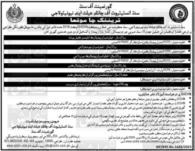 | Consultant Pediatric Infectious Diseases | 1 | FCPS (Pediatrics) with subspecialty in ID | SICHN Korangi Campus |